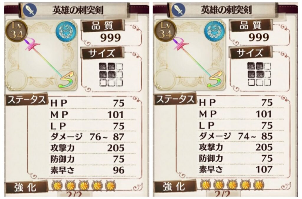 左は全てハルモニウム強化。右は最後だけルビリウム強化。基礎ダメージ2と素早さ11のトレードオフ。