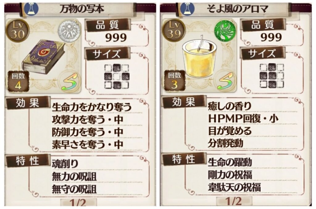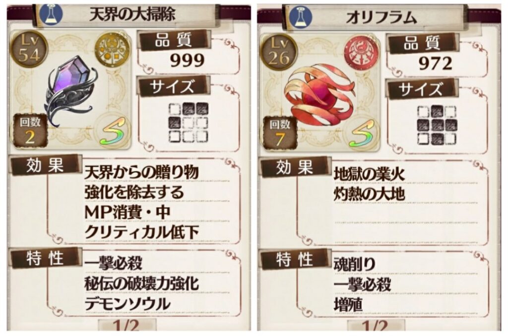 雑魚戦用。書架の敵で試すとすぐわかるが、魂削りの有無で一撃死の発生率が全然違う。ピンポイントフレアを発現させないように注意。プラフタとコルネリアにも複数持たせ、ソフィーが撃ち切り次第交換すれば長期運用も可能。