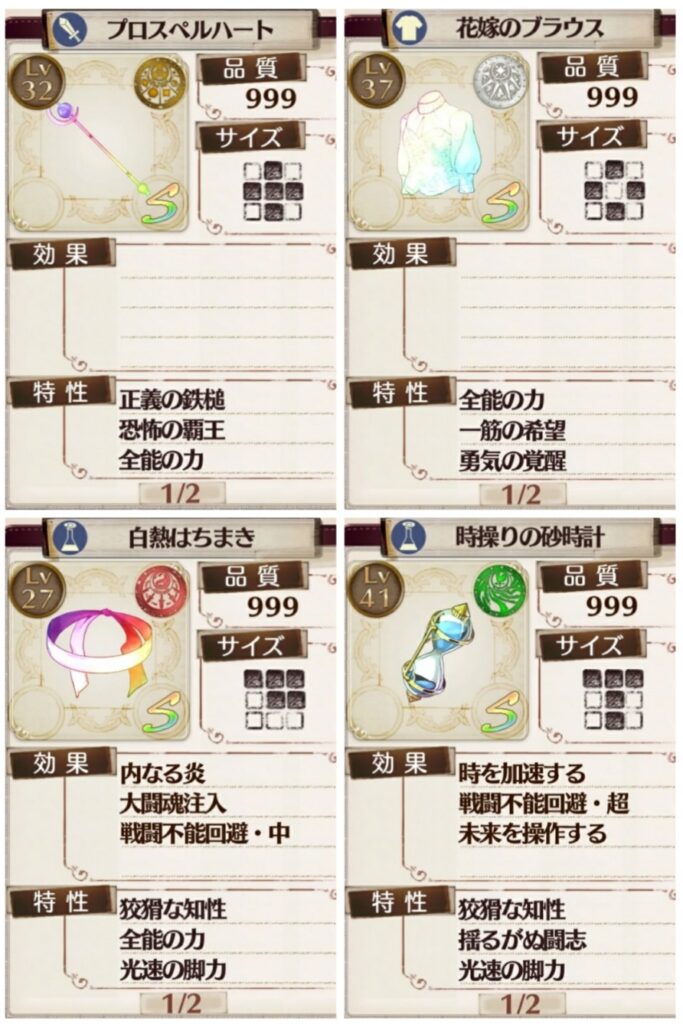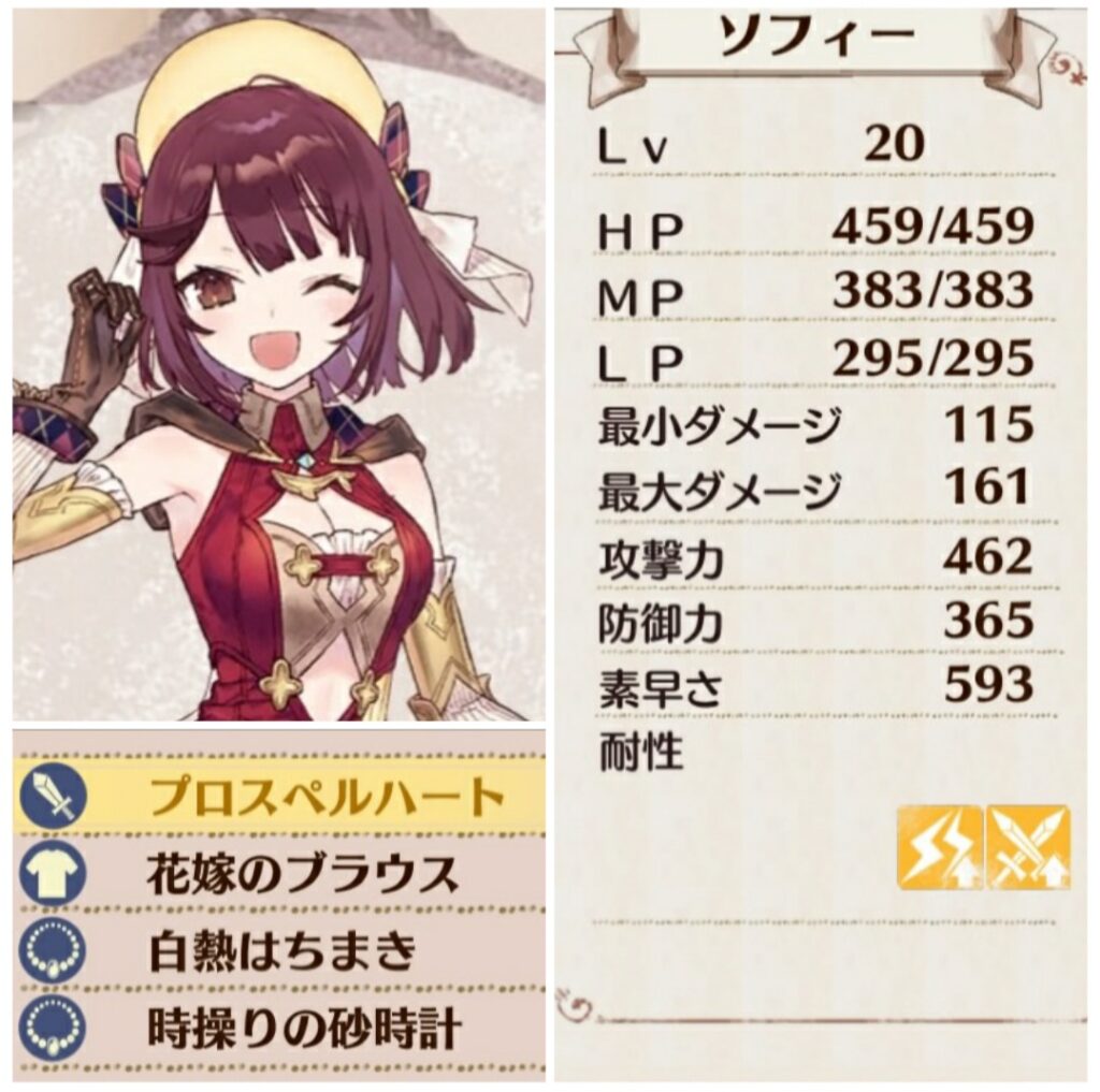 武器強化はソフィーはルビリウム。他のキャラはハルモニウムだが、最後だけルビリウム。防具は全員フリューゲル。特性は知識の探求・スーパースキル・エボルブボディ。強化減衰回避のテクニックを利用して強化。