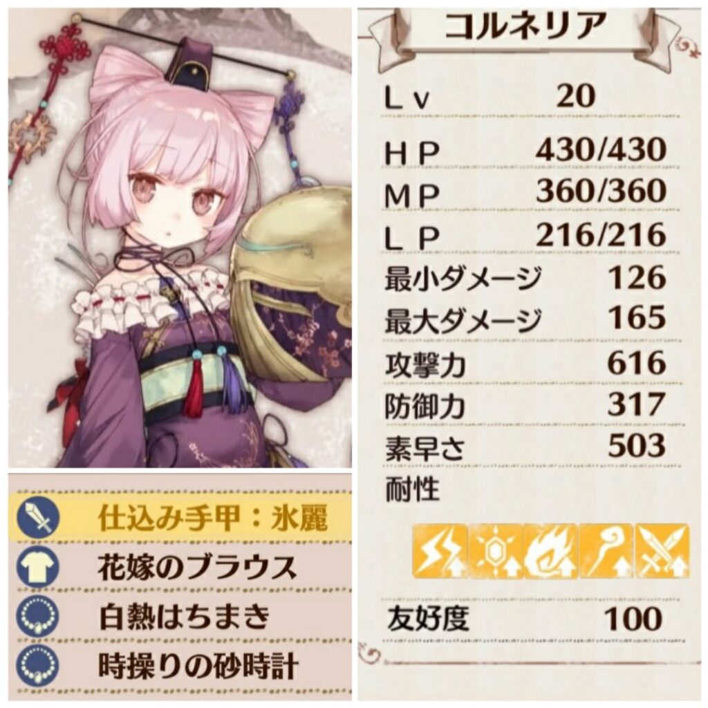 サポート攻撃に入る回数を増やすために行動順が2番目になるようにしている。また、風来人のシャツで攻撃力を高めるよりも、ブラウスで攻撃回数を安定させた方が良い結果が多かった。