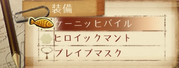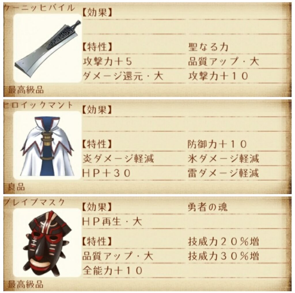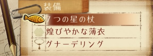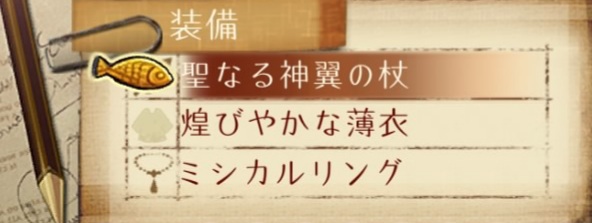 アイテム中心の戦い方になるので攻撃力よりも耐久力と素早さを重視。武器の○○の力は耐性上昇目的。防具は素早さの上昇量が高い煌びやかな薄衣。技威力増はデュプリケイトにも影響する。