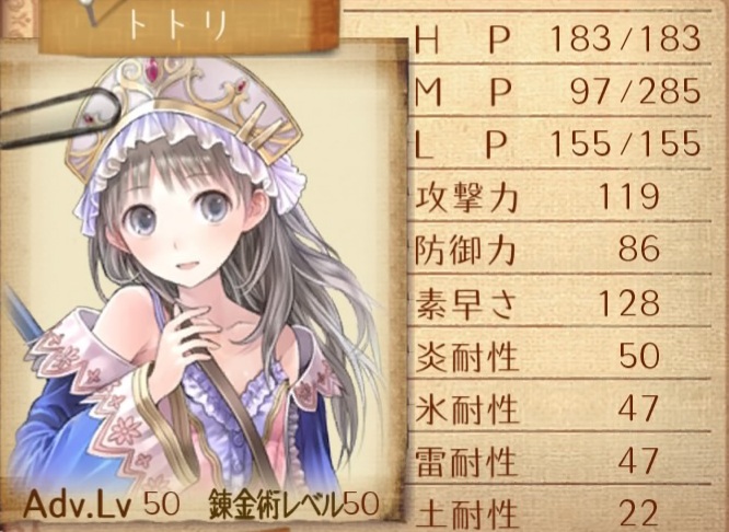 ボス戦でのアタッカーを担うので攻撃力重視。素早さも同時に上げる。ただし、戦術上トトリより後に動いて欲しいのでトトリとの速度差も考慮。この速度差ならトトリより先に動く事はないと思う。