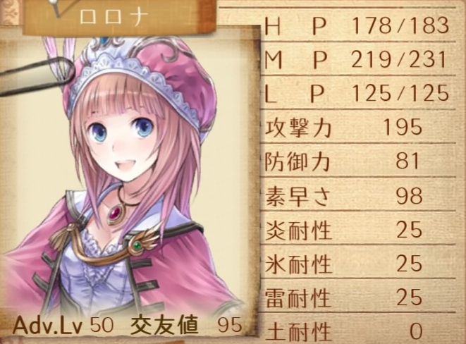 アシストガードでトトリを守る肉壁仕様。…なのだが、基本的にトトリとロロナが自分と敵より先に動くので何もせずに終わる事が多々ある…。このHPならブラッドエレメントの闇の矢と柱のコンボにも耐えられる。