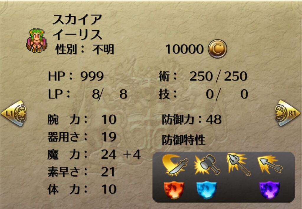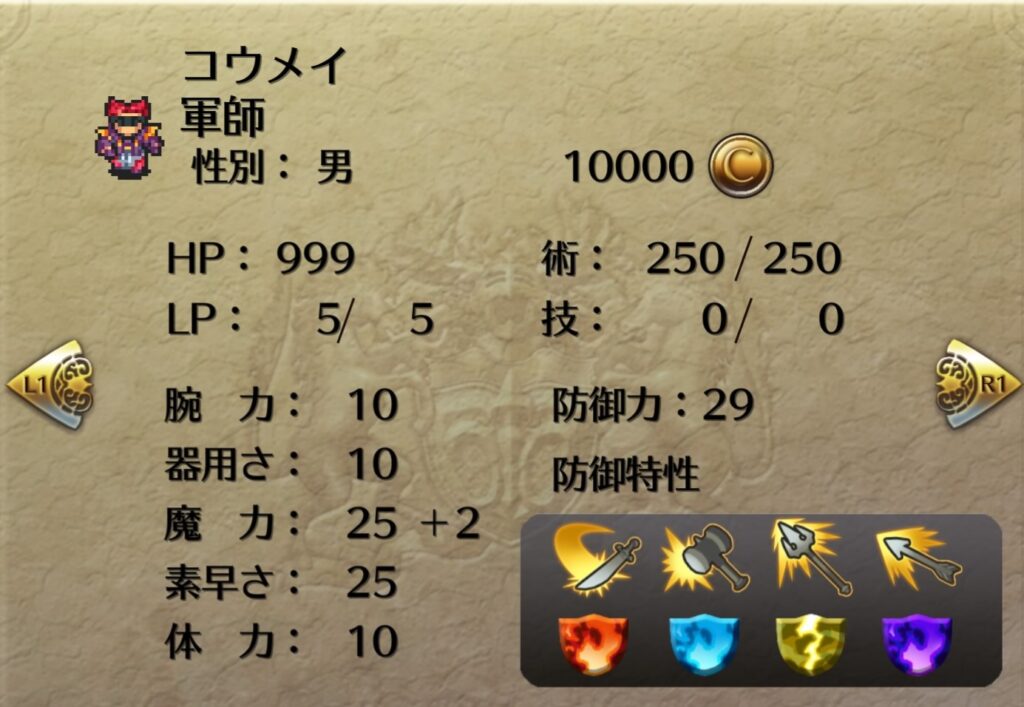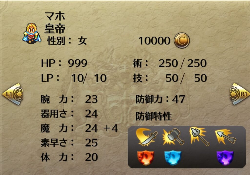 コウメイを最後の皇帝にしてライブラを起用することも考えたが、固定装備があまりに脆弱なため見送った。ライブラの術威力は47なのでマリアと同等。