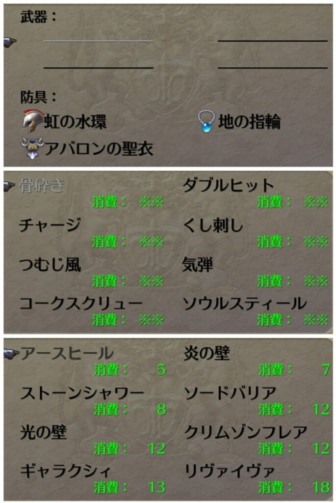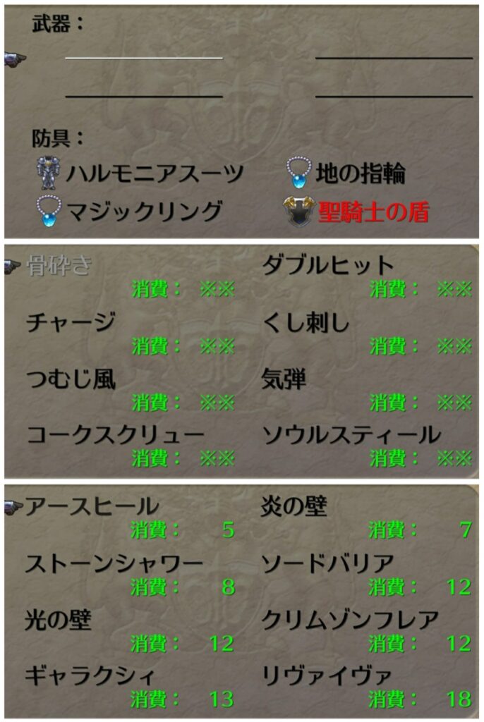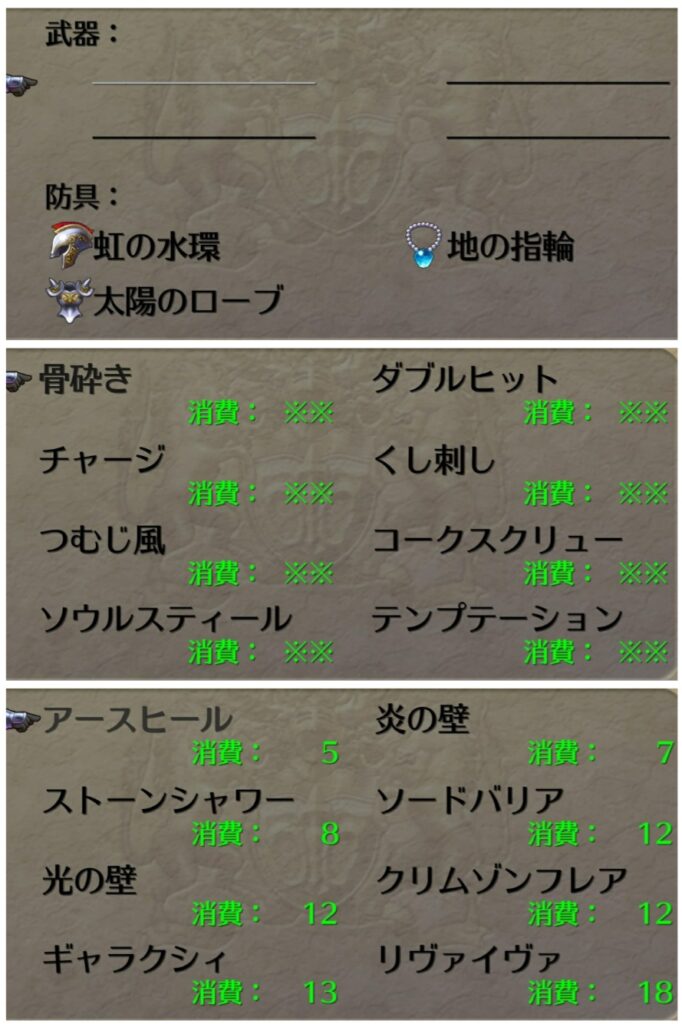 太陽光線などのそこそこの威力の単体攻撃術と全体合成術が使えるようになってくると大分楽になり、ストーンシャワー解禁で全てが報われる。以降はより強力な術が揃ってくるのでどんどん楽になってくる。
