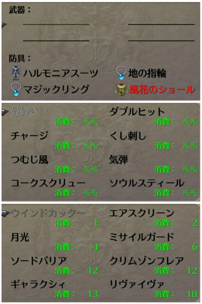 パワーレイズを活用しても魔力+2の補正がないと七英雄戦で6000ダメージを突破できない。ハルモニアスーツ+地の指輪+マジックリングだと状防御87と若干不安があったので、最終装備でも採用しているこの装備にした。