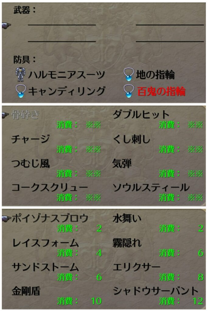 魔力+3はないと6000を突破できない。固有装備の状防御が高いのでハルモニアスーツ+マジックリングの組み合わせで物理防御と魔力補正を確保。行動後自動防御を得られる位置はコウメイに譲る。