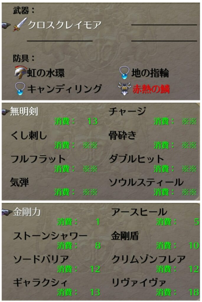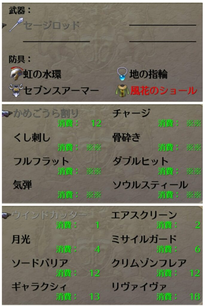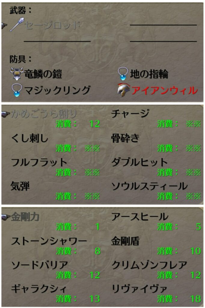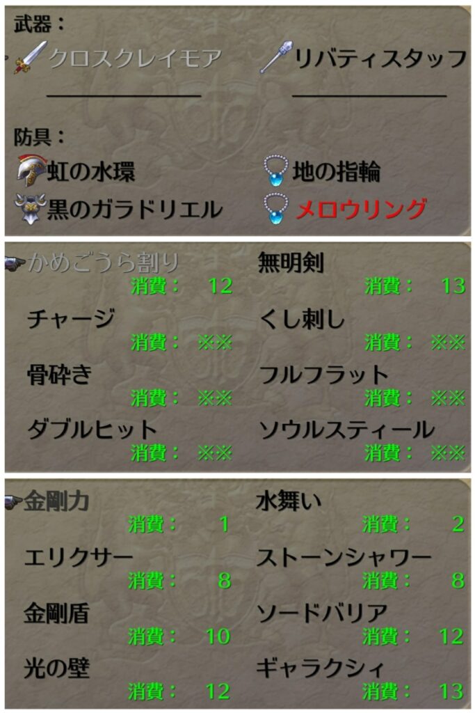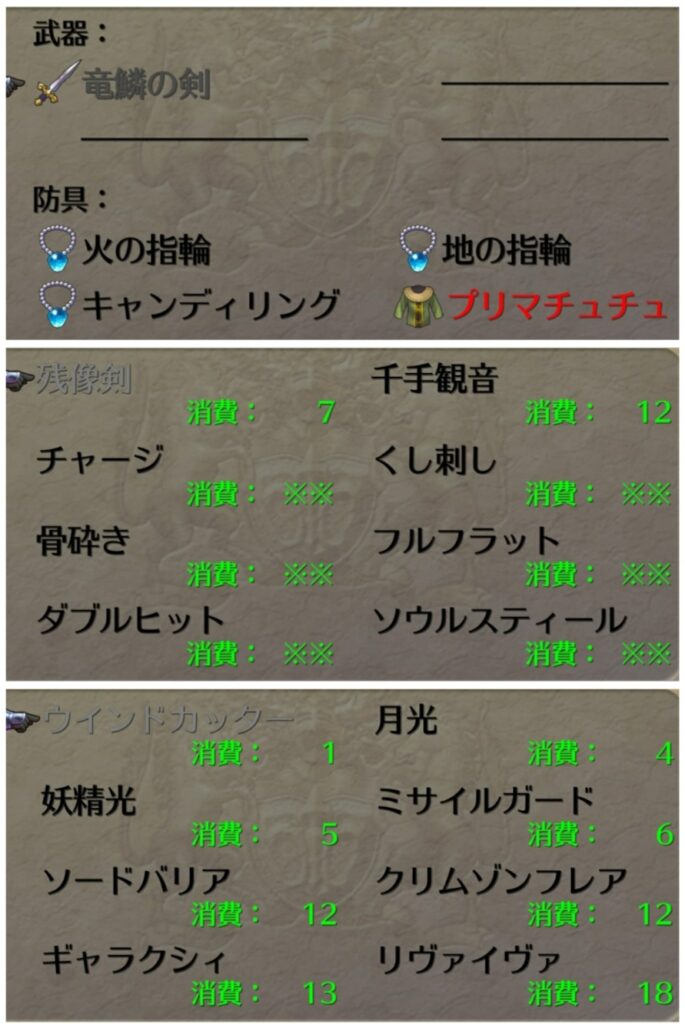 雑魚戦用に竜鱗の剣+残像剣。術威力は15と元々最下層レベルなところにキャンディリングの理力上昇で更に弱まっているので絶望的。このゲーム、補助系の術には魔力関係ないのがほんとありがたい。