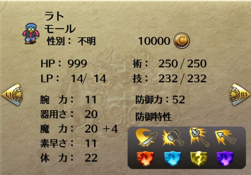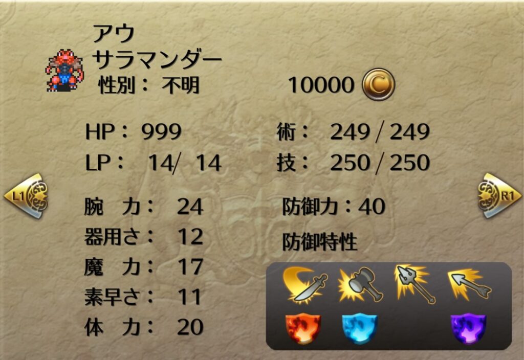 最終皇帝には及ばないものの優秀な能力値で体術向き。人工物だからか術の威力は絶望的。
