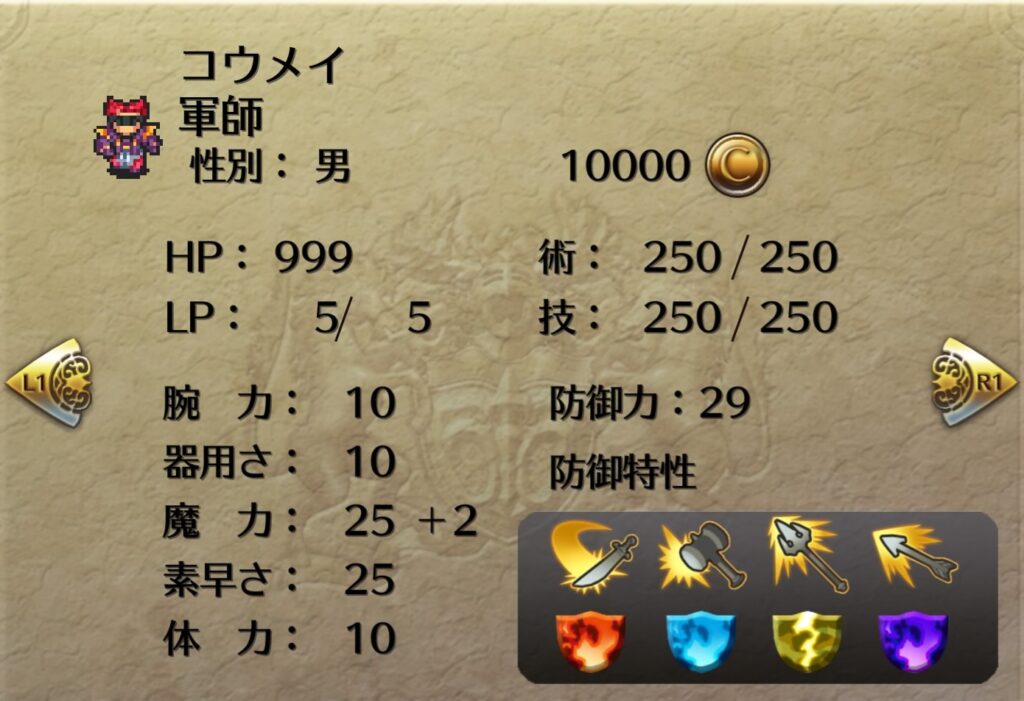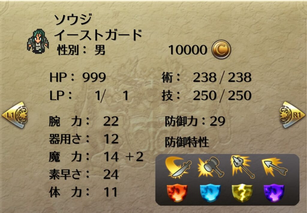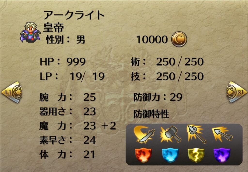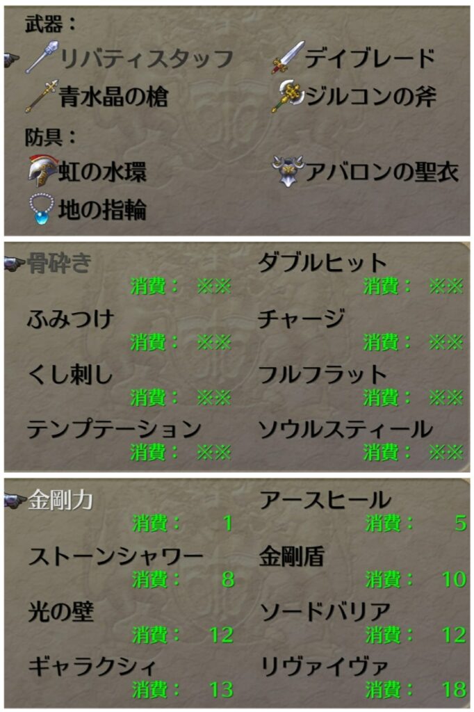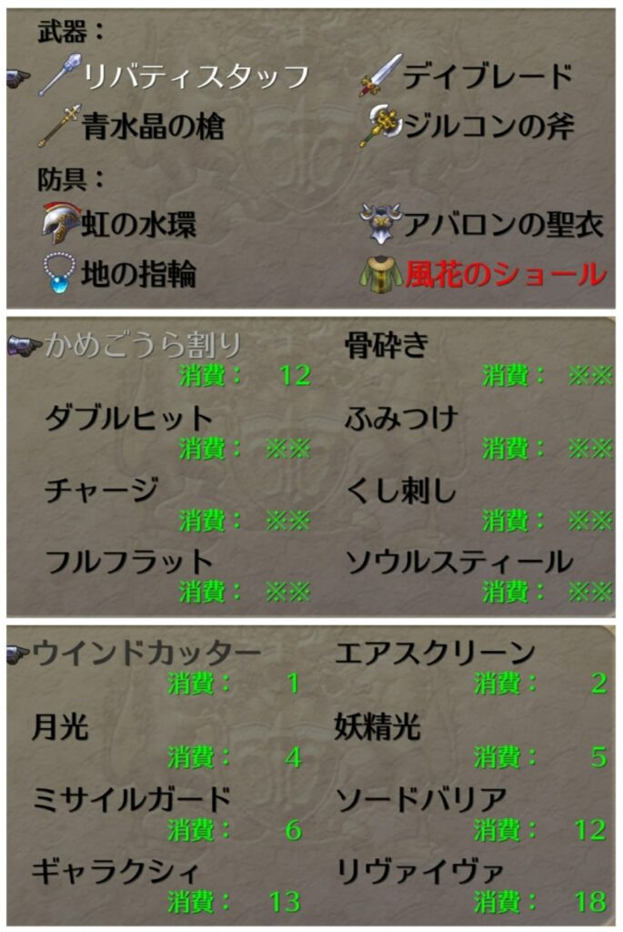 装備は皇帝と同じ。多周引き継ぎしているので実現可能となっている。地術使いがコウメイしかいない関係で金剛力を撒くのが面倒に感じたので、前衛各人は補正は落ちるがリバティスタッフの祝福で代用できるようにしている。