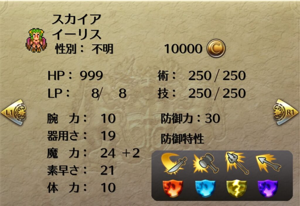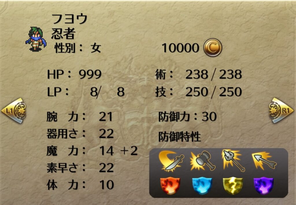 術威力16なのでダメージは期待できない。皇帝との差別化で水術にしたが、回復は月光使うし、状態異常はほぼかからないので正直使わない……。