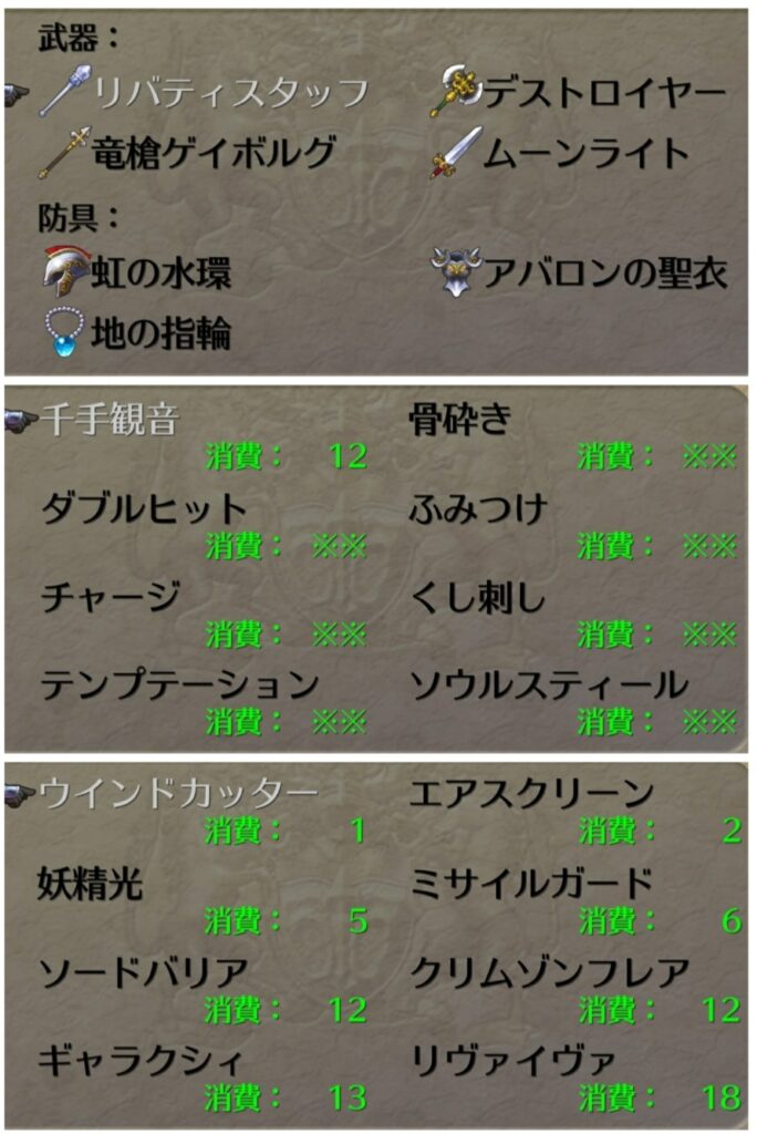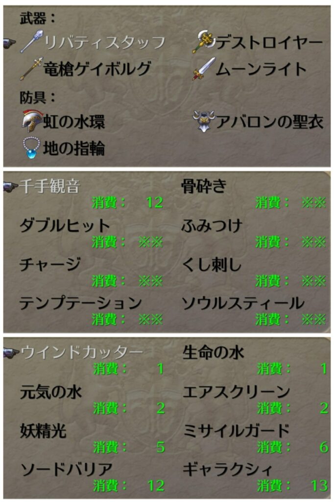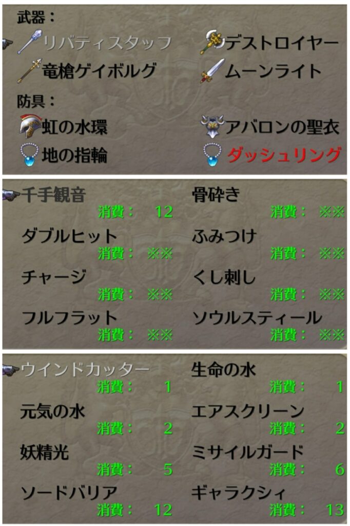 技欄を見切りに割きたかったので千手観音以外の技は装備固有技を利用。ムーンライトの月光・月影とリバティスタッフの祝福は重宝する。ゲイボルグとデストロイヤーは………趣味です。
